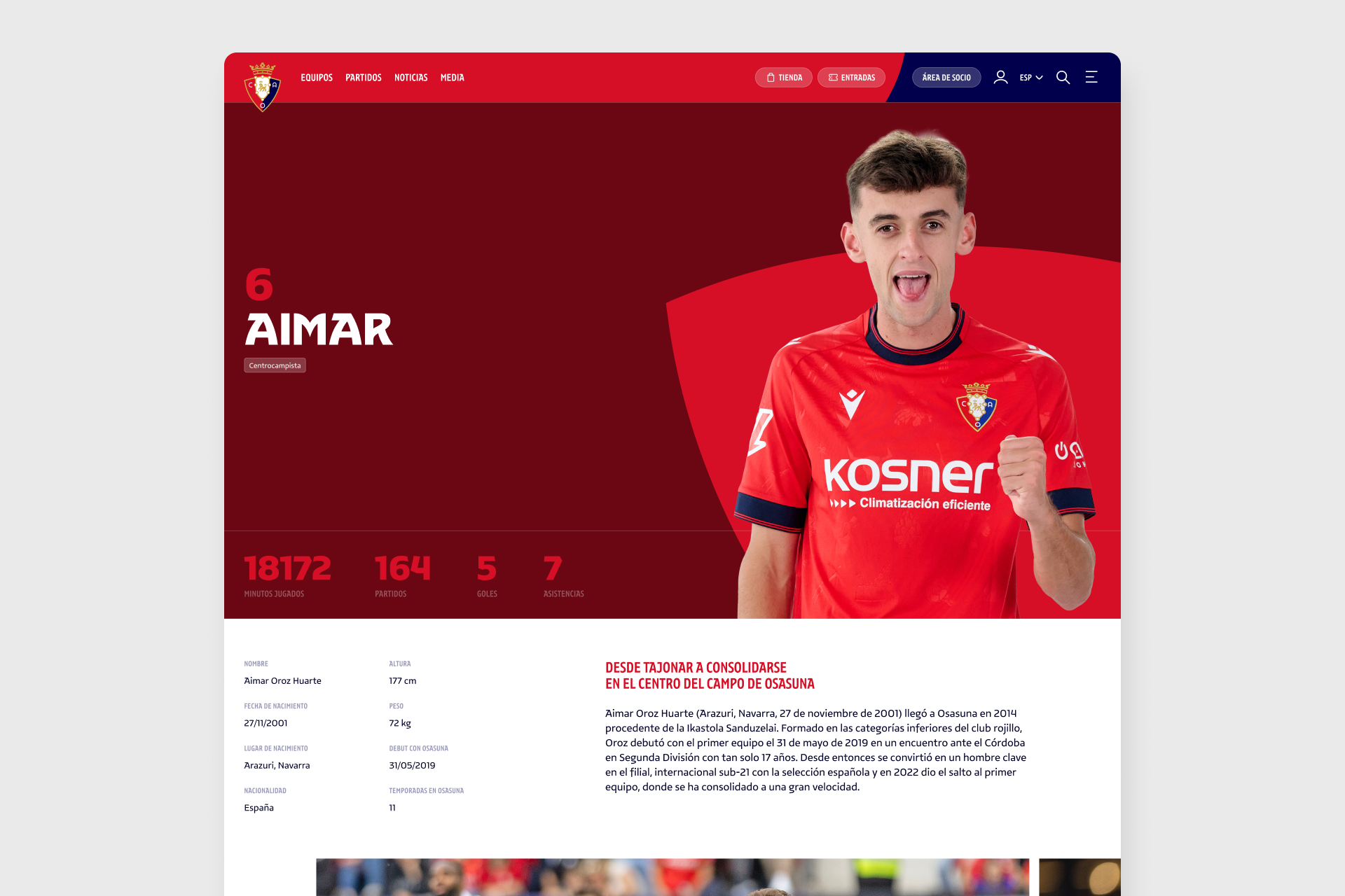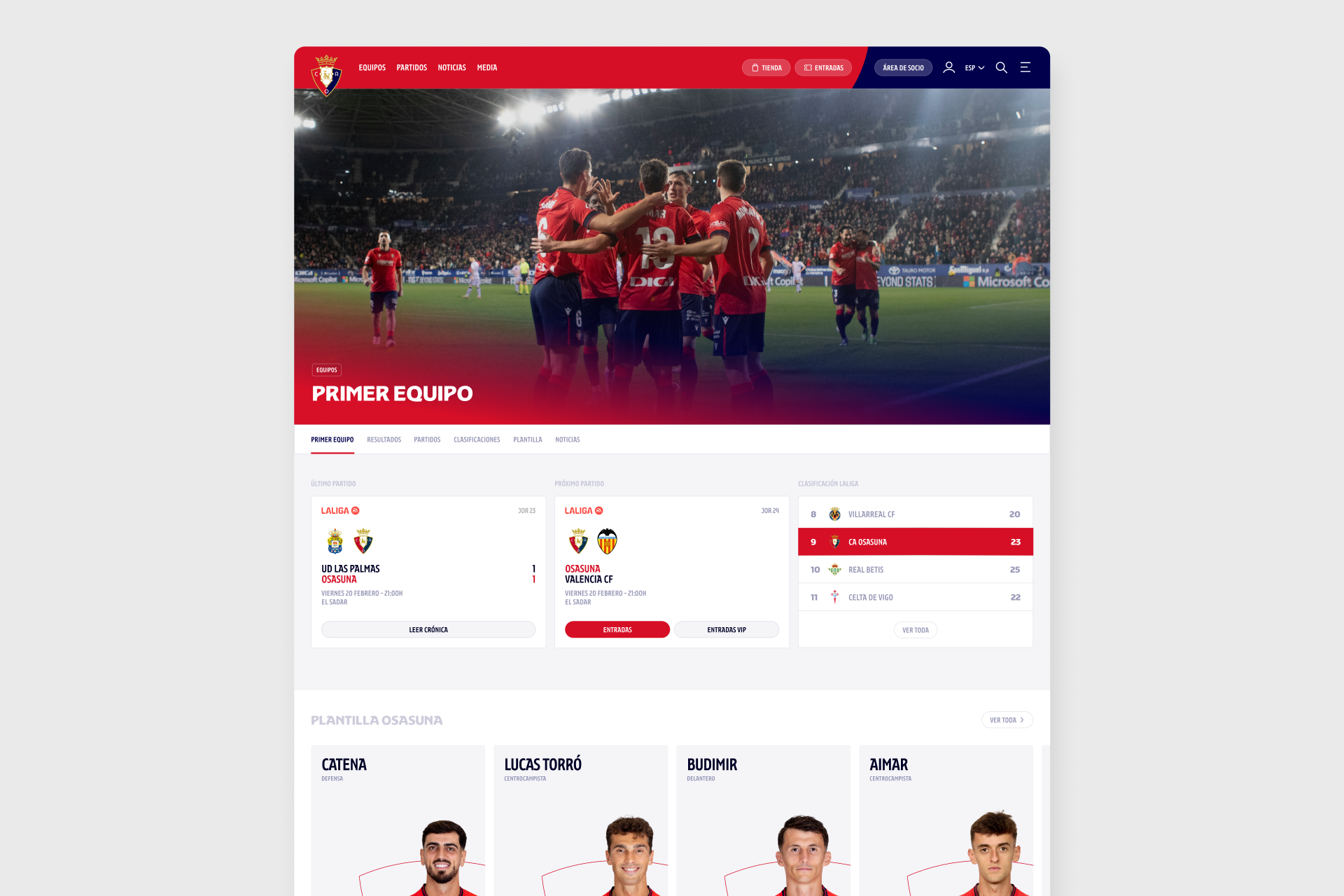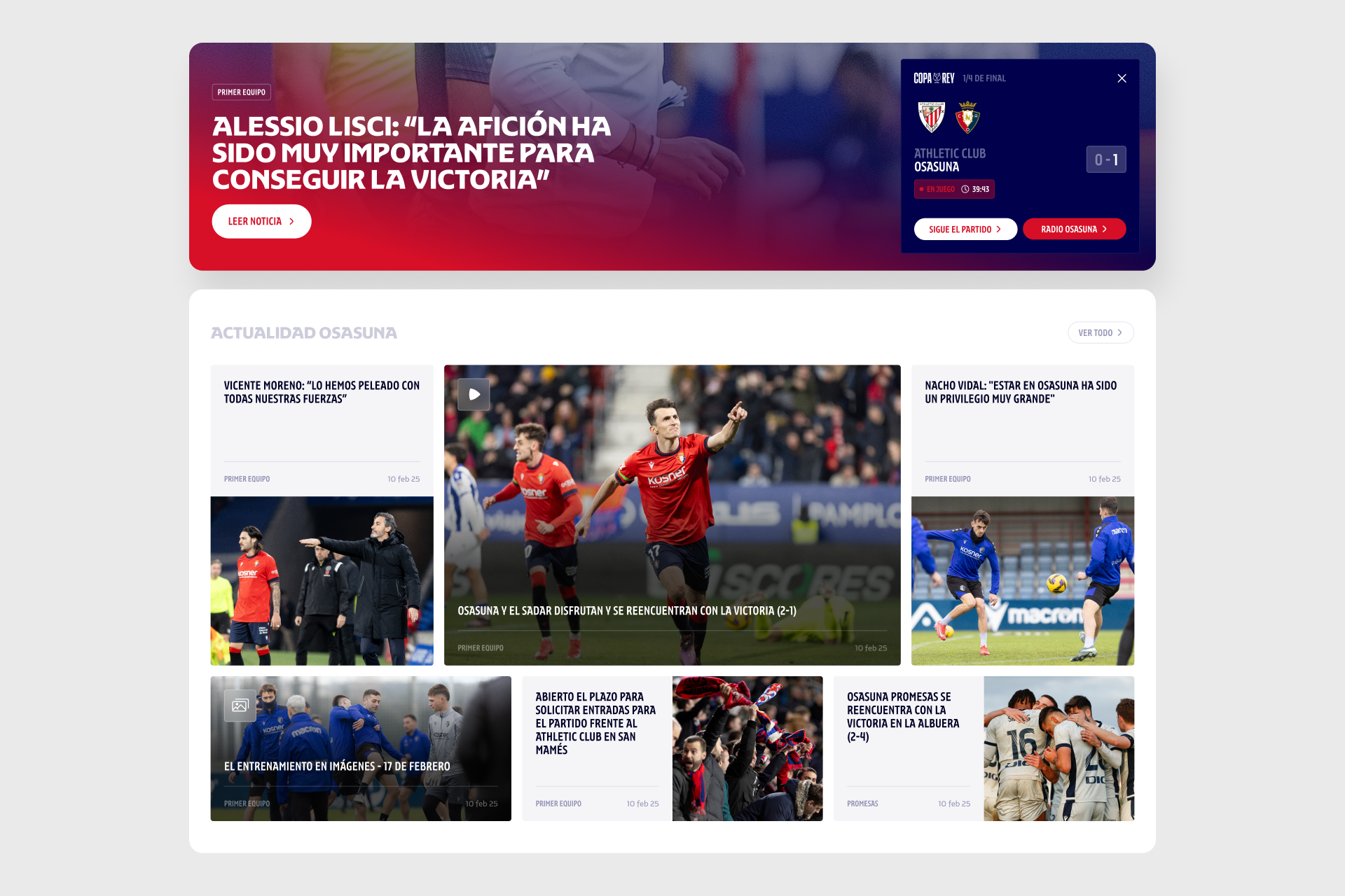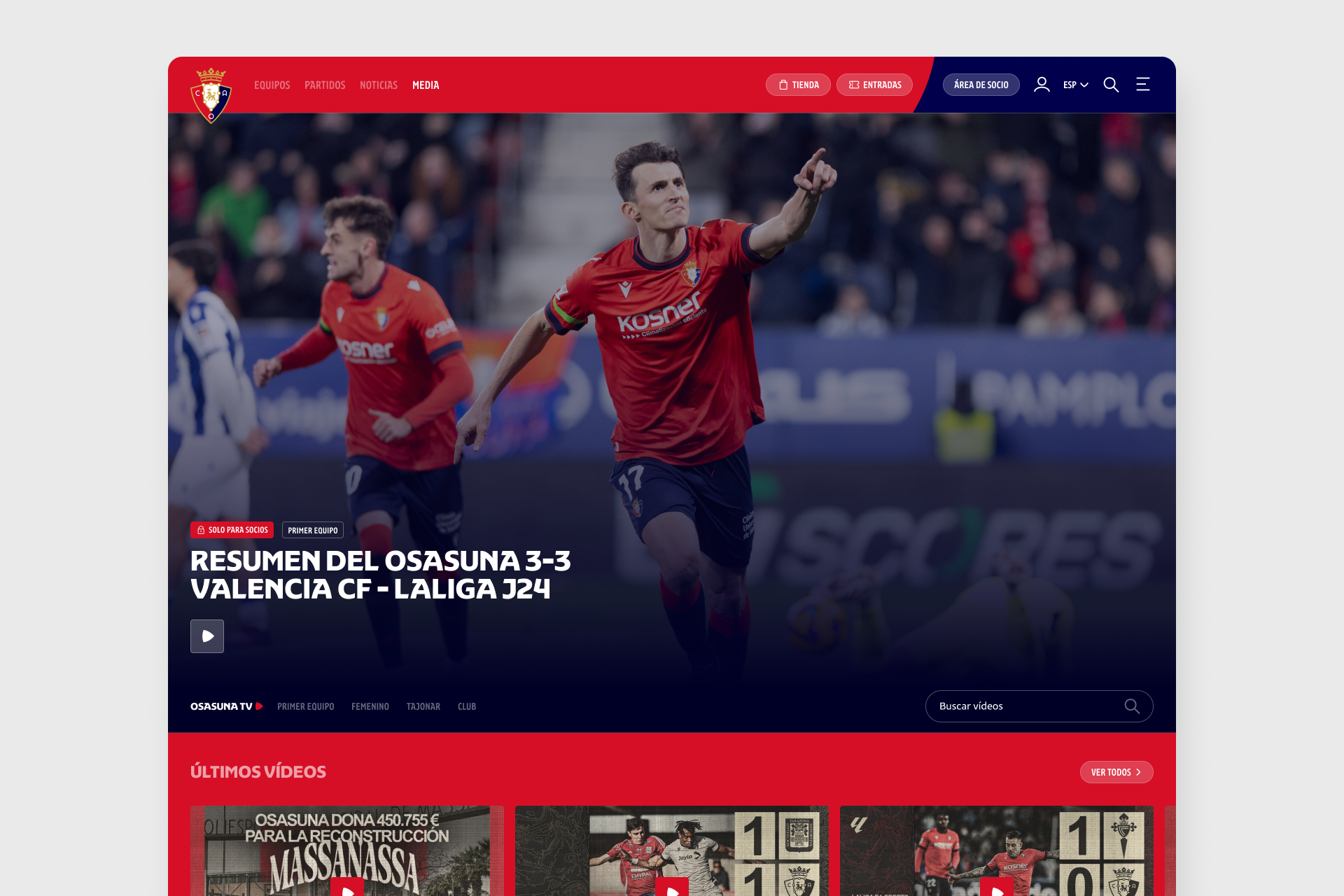 Con un diseño que respira osasunismo en cada una de las distintas páginas y cada detalle, hemos querido cuidar al aficionado y facilitarle la experiencia de usuario en la web: desde la búsqueda de cualquier contenido al instante a la reproducción de contenido multimedia de forma automática para hacer la experiencia más inmersiva. Sin olvidarnos del match center, donde los días de partido, la web se centra en el seguimiento del partido con estadísticas e imágenes en tiempo real.