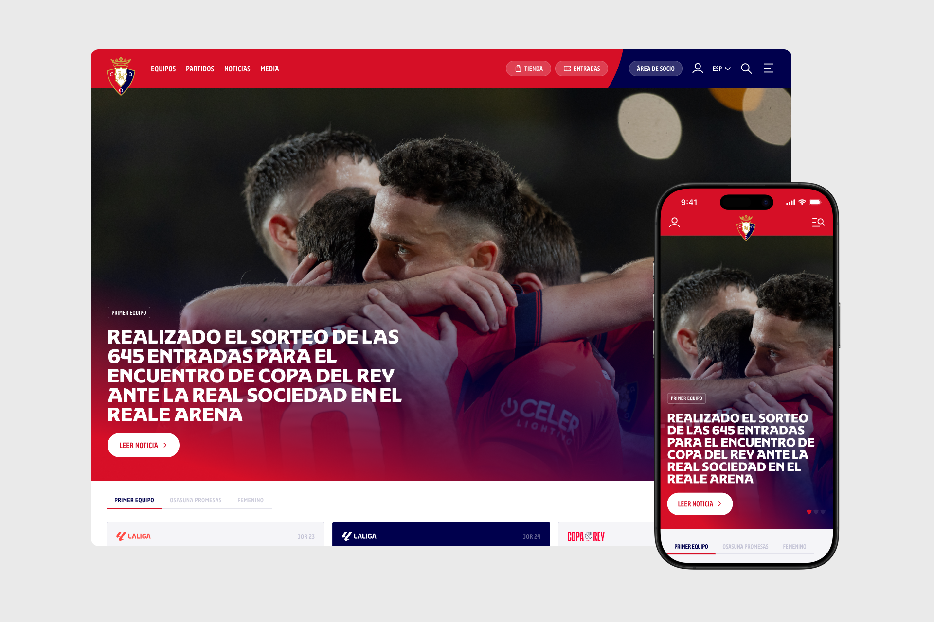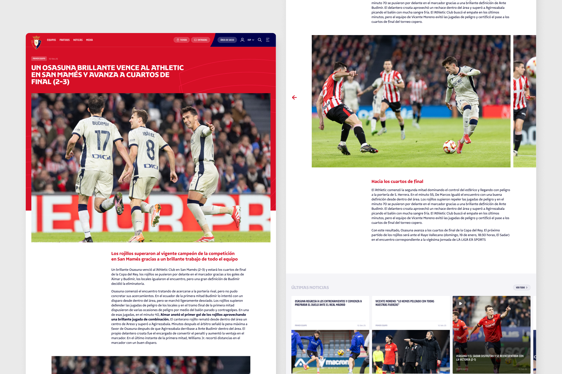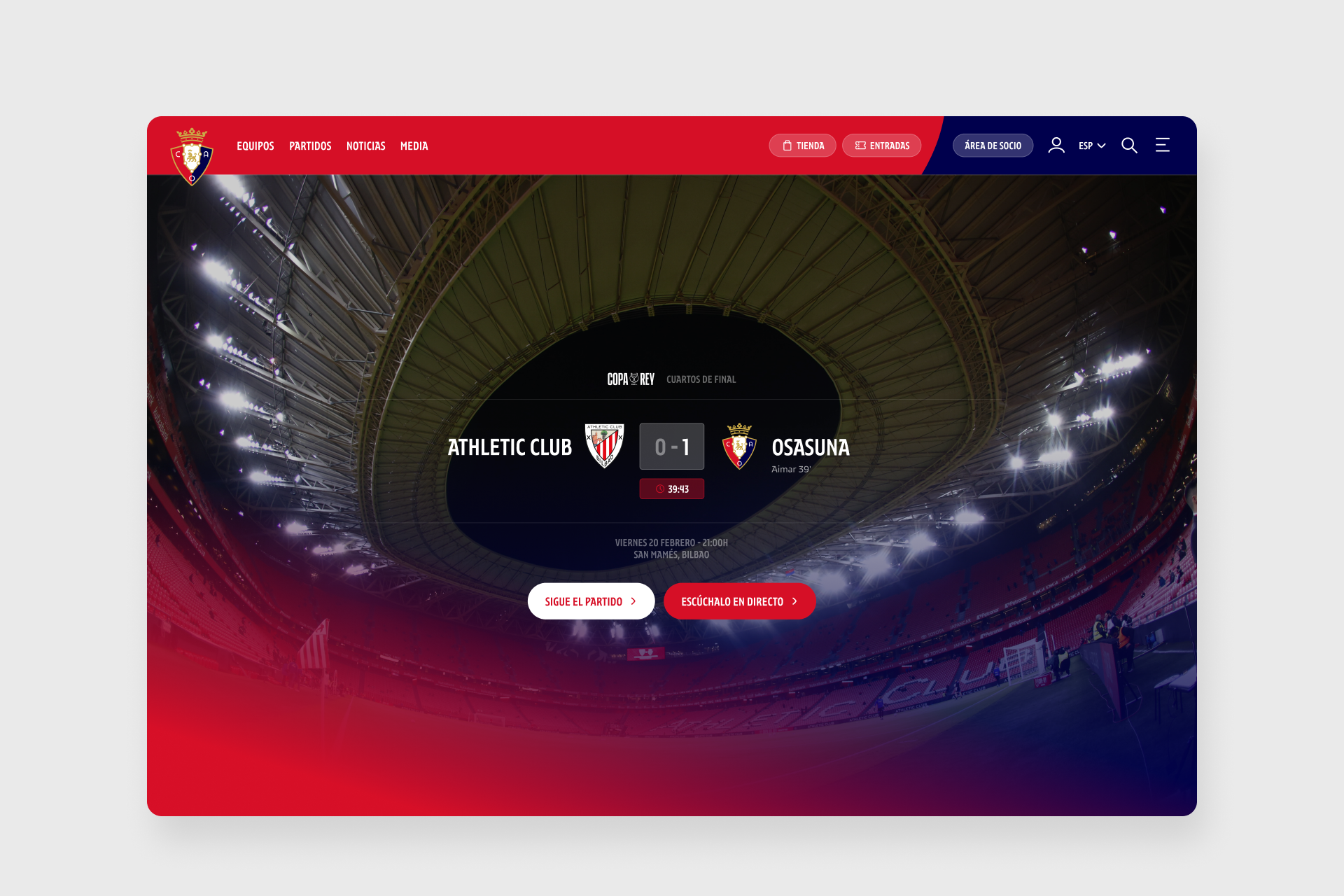 Con un diseño que respira osasunismo en cada una de las distintas páginas y cada detalle, hemos querido cuidar al aficionado y facilitarle la experiencia de usuario en la web: desde la búsqueda de cualquier contenido al instante a la reproducción de contenido multimedia de forma automática para hacer la experiencia más inmersiva. Sin olvidarnos del match center, donde los días de partido, la web se centra en el seguimiento del partido con estadísticas e imágenes en tiempo real.