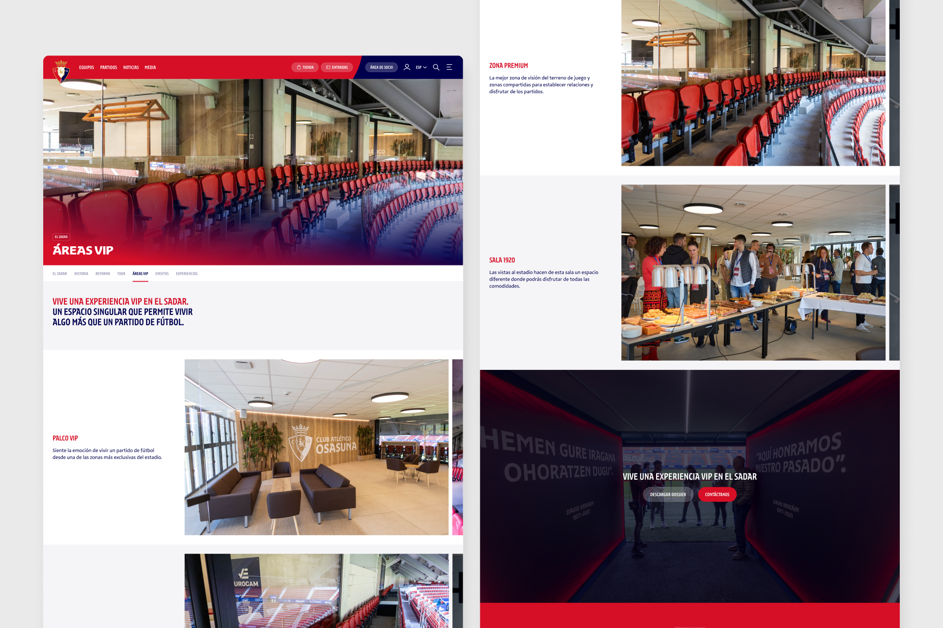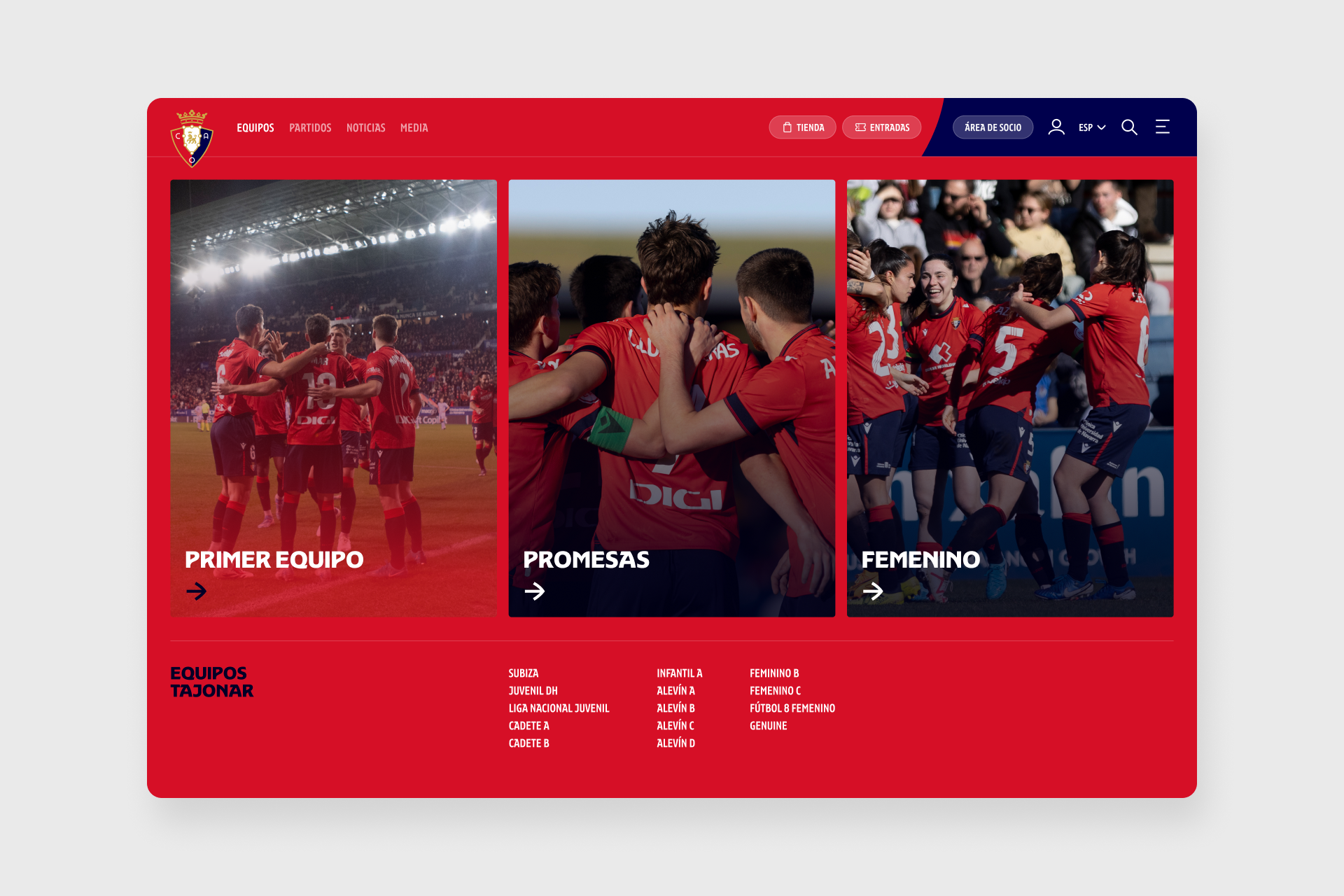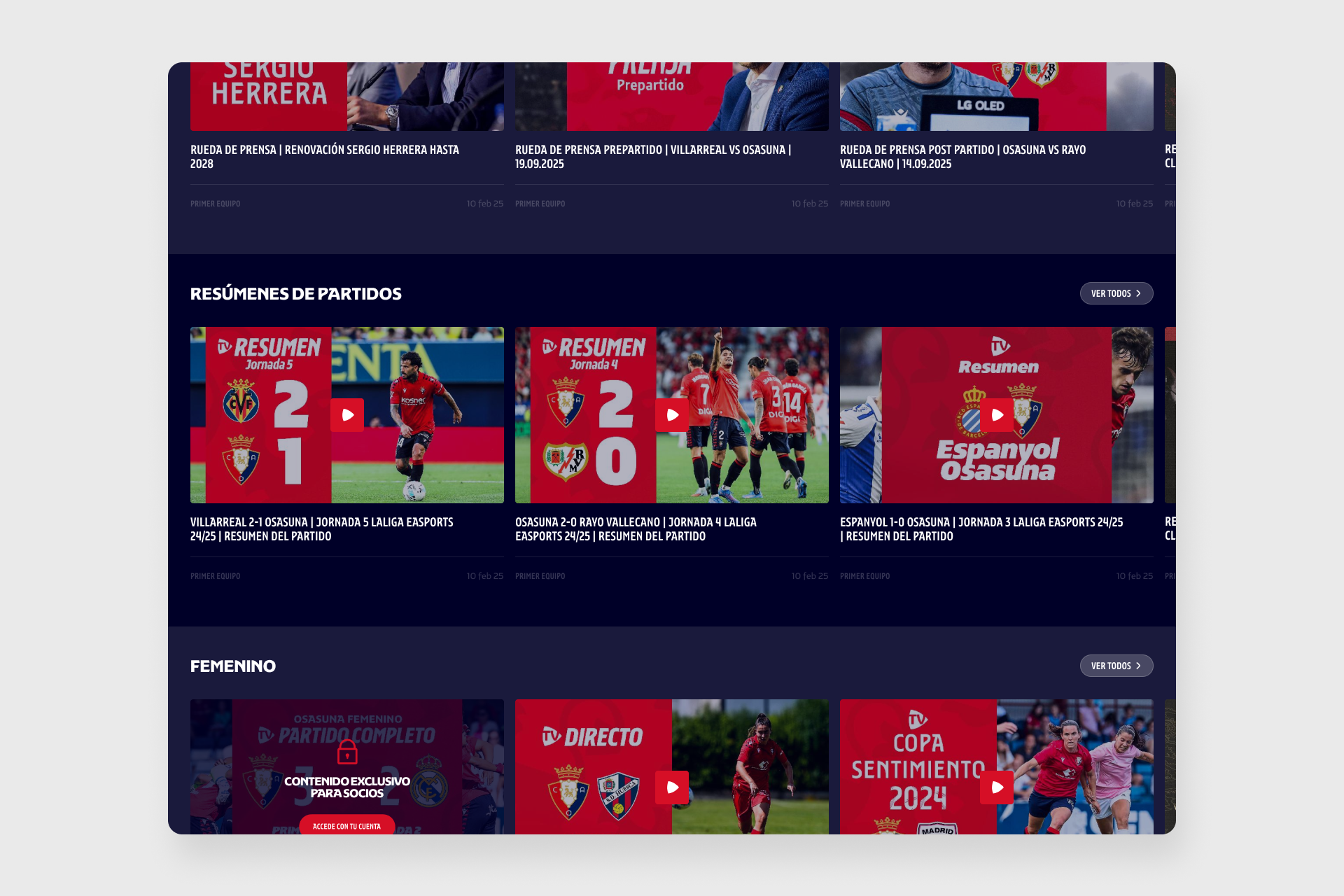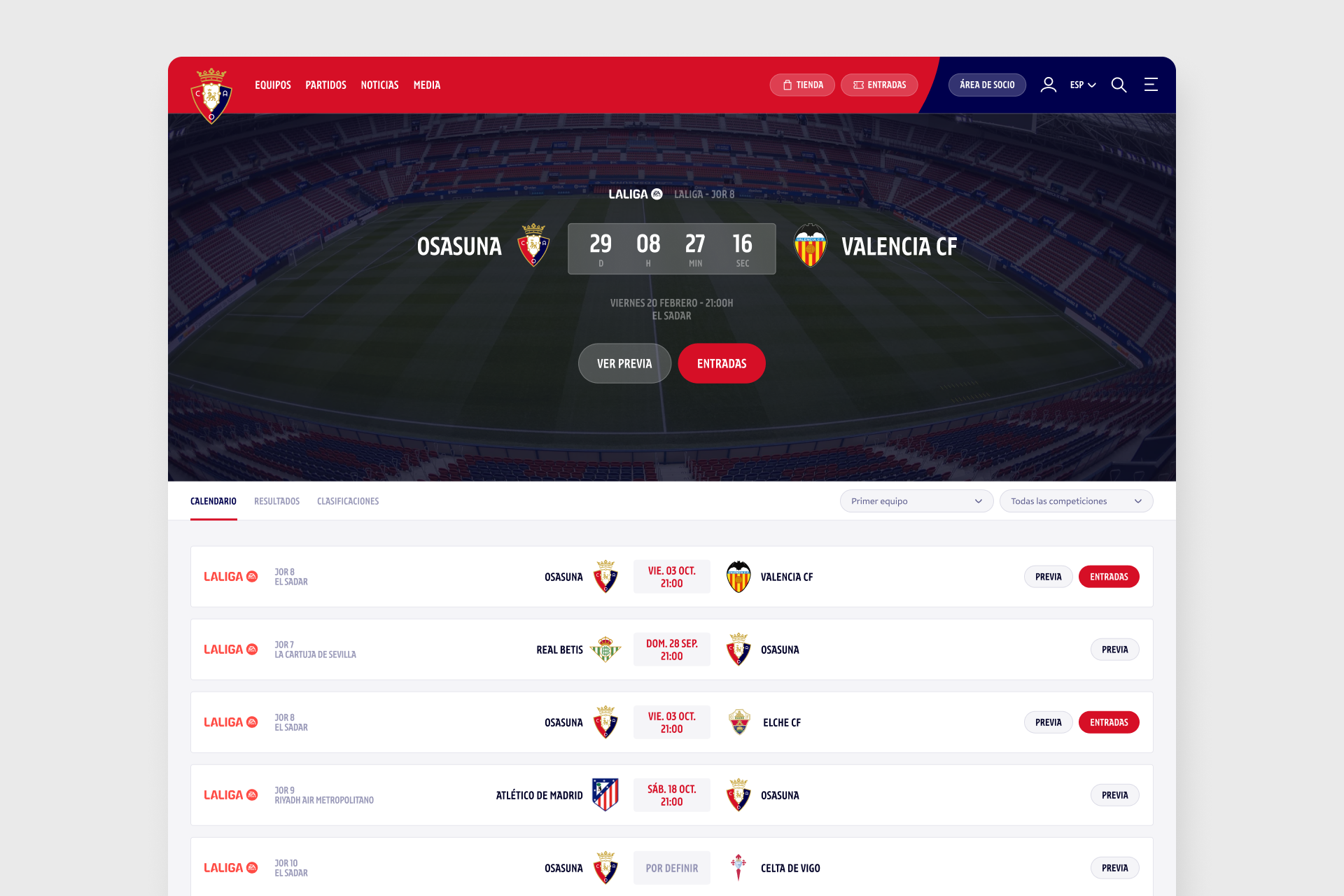 Con un diseño que respira osasunismo en cada una de las distintas páginas y cada detalle, hemos querido cuidar al aficionado y facilitarle la experiencia de usuario en la web: desde la búsqueda de cualquier contenido al instante a la reproducción de contenido multimedia de forma automática para hacer la experiencia más inmersiva. Sin olvidarnos del match center, donde los días de partido, la web se centra en el seguimiento del partido con estadísticas e imágenes en tiempo real.