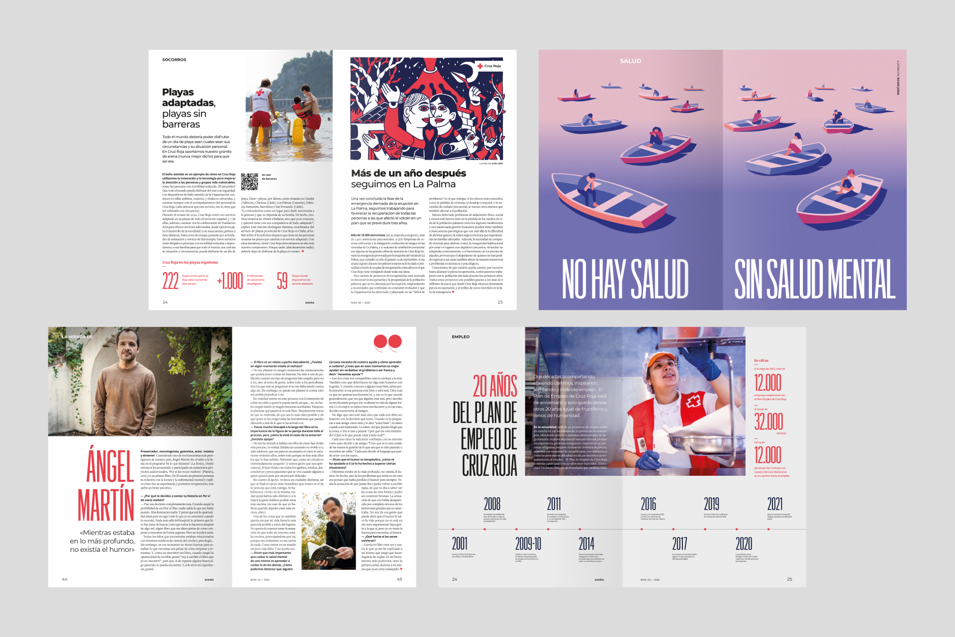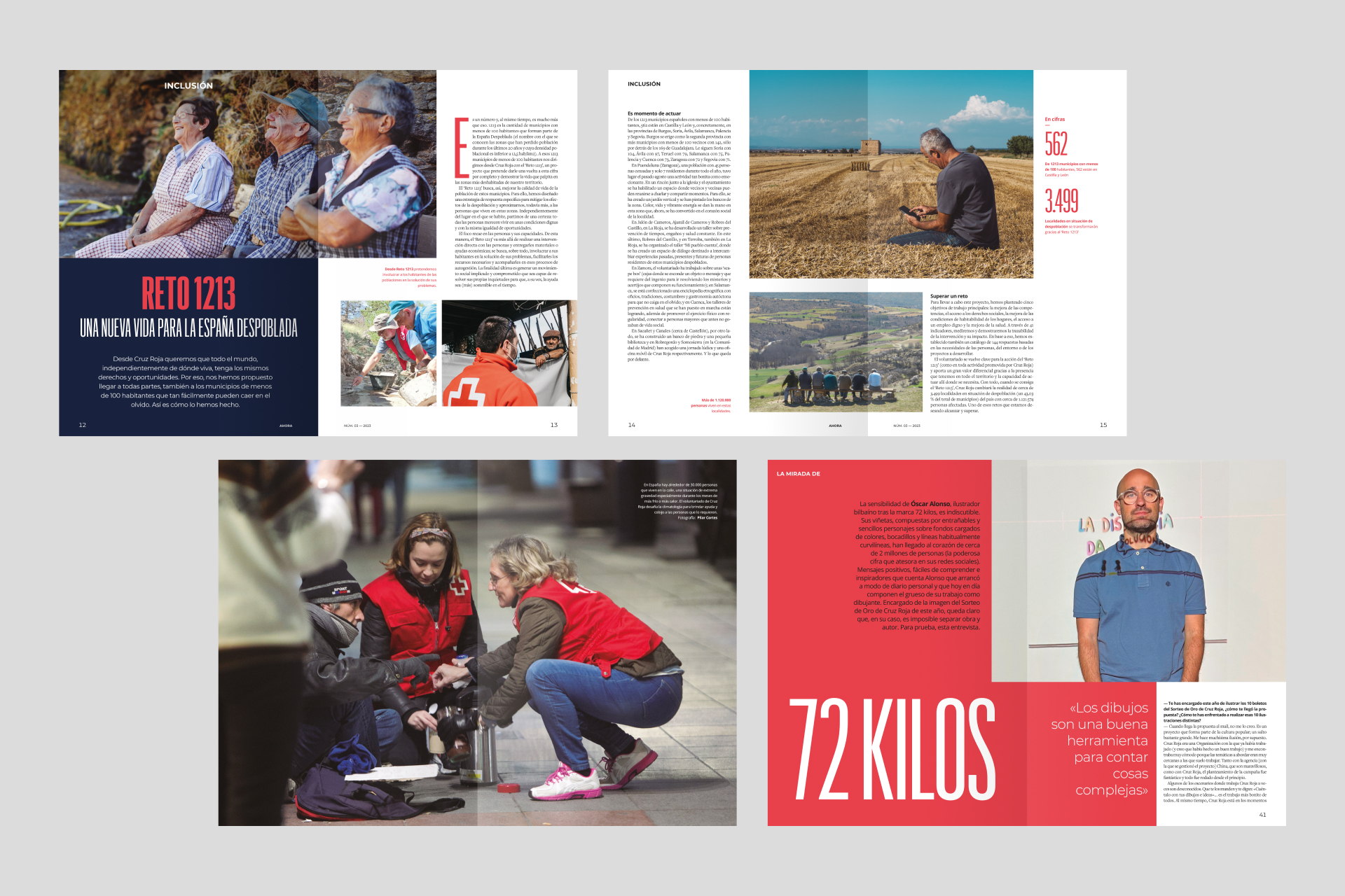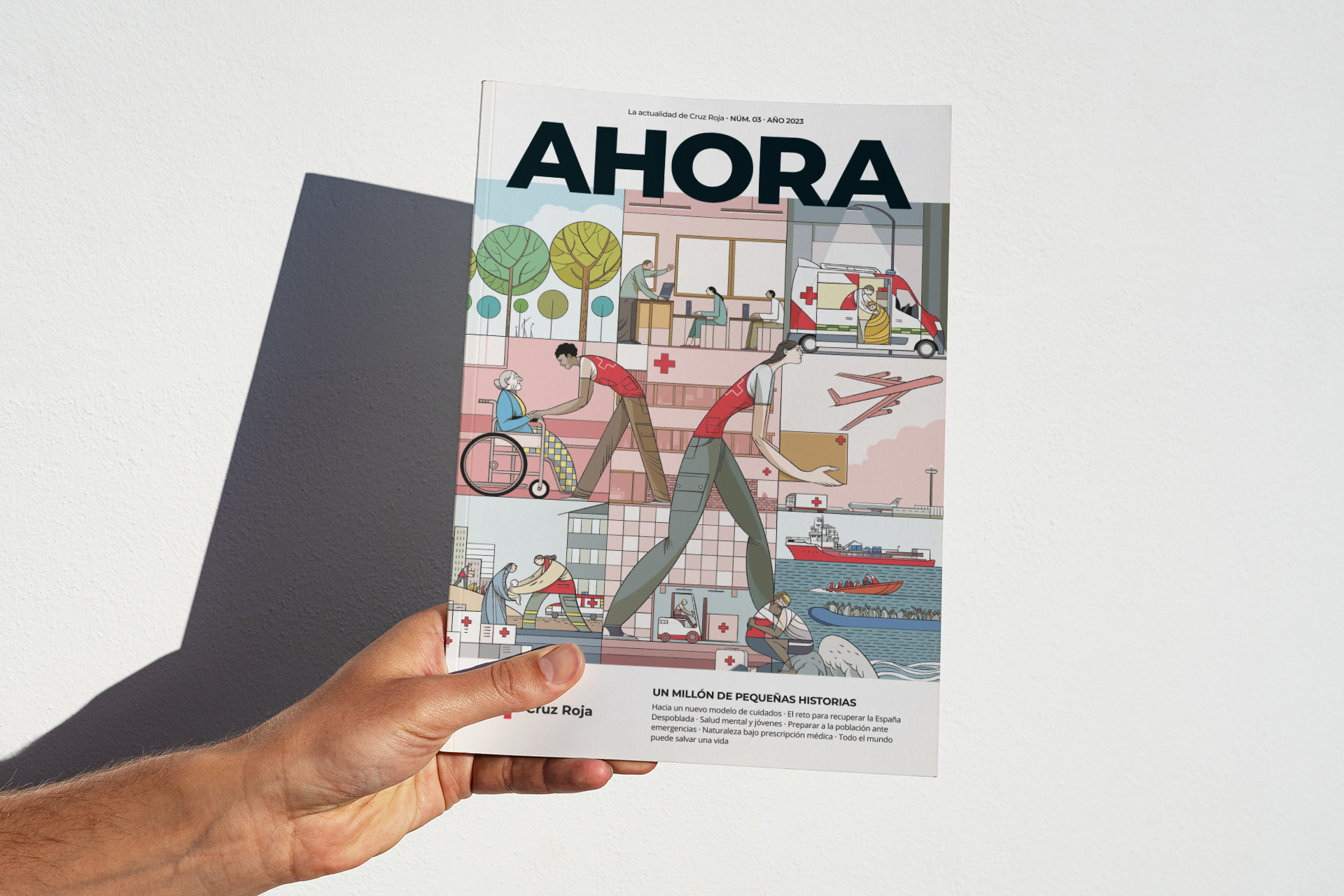 Llevamos desde 2021 dedicando tiempo a este apasionante proyecto; capitaneando la parte editorial (siempre de la mano de Cruz Roja) y (re)convirtiendo piezas digitales en noticias, reportajes, entrevistas y otros contenidos en un formato de cerca de 70 páginas en el que también hay lugar para piezas totalmente inéditas. La publicación también nos ha permitido trabajar con los mejores ilustradores del panorama nacional, tanto en la portada (uno de los puntos fuertes de la revista, y en la que hemos contado con la firma de algún que otro Premio Nacional de Ilustración) como en otras ilustraciones dentro de la revista, en forma de cómic e incluso de mapa. Todo al servicio de lo que queremos transmitir.
